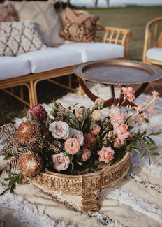 A mixture of blush, and neutral flowers intertwined with lush greenery native to the area ascended up the entrance of the tipi, drawing the attention to the wooden chandeliers that delicately hung above. We filled the tipi with a mixture of soft colours and natural textures as we didn’t want to use anything too harsh that may draw attention away from the beautiful surroundings.
